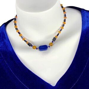 Beaded Lapis, Tiger Eye, Swarovski Crystal & Gold Choker Necklace