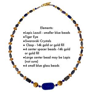 The faceted blue beads are lapis lazuli and the amber colored crystals are Swarovski crystals. There are a few small gold beads in the middle that I believe are 14 carat gold. Other gold beads and the clasp may be gold fill. The blue center piece may or may not be lapis.