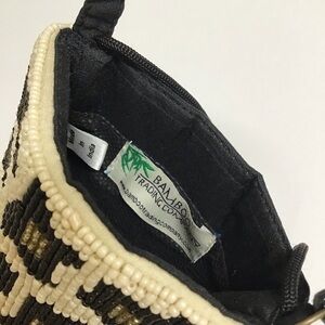 Hand-beaded by artisans in India. Includes a 54" cross body strap that can tuck inside when not in use, a short strap that unsnaps so the bag can be attached to a larger bag or belt, and a separate, secure zip pocket for cash and credit cards. Black fabric back, liner and accents.