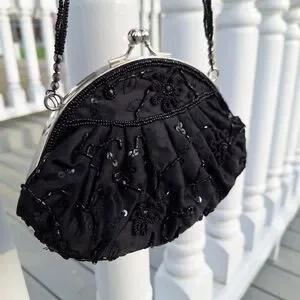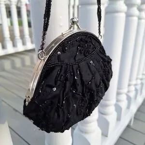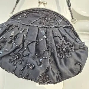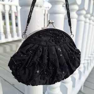 Beaded Mini Bag Black Sequin Kisslock Le Regale Classic Vintage Satin Purse