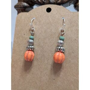 These adorable Beaded Pumpkin Dangles offer a clean, classic look for the fall season. They showcase a round, ribbed candy-orange bead at the bottom, mimicking a small pumpkin. This is stacked with three elegant, bright silver-tone spacer beads and accented with a small teal/green bead at the top, completing the harvest color scheme. They are a simple, high-quality, and versatile addition to your autumn jewelry collection.