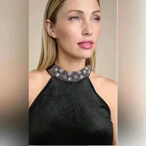 In all-over silky velvet, this sleeveless mock-neck jumpsuit achieves the luxe look with ease. Buttoning in the back, the high neckline flaunts an intricate beaded design (think of it as a built-in statement necklace!). Wide-leg styling and a subtle back zipper complete this sophisticated jumpsuit.