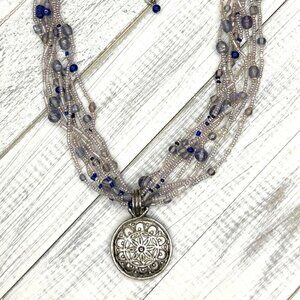 A stunning beaded multi-strand necklace featuring a silver-tone pendant. Boho style with blue beads, perfect for adding a touch of elegance to any outfit.
