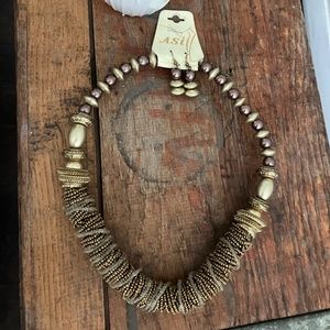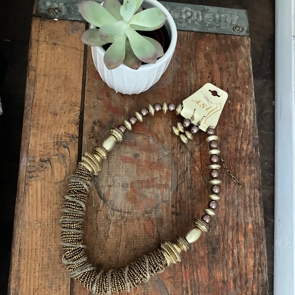 Beaded Necklace & Earrings Matching Set Brass, Golden, Metallic, Bronze colors