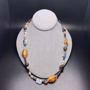 Mixed material beaded necklace with copper leaf toggle clasp; Approx 22" long; good condition