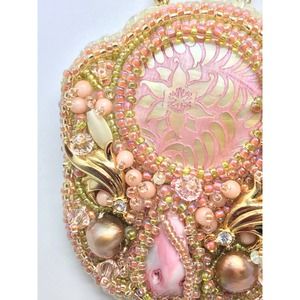Beaded by me. This creation took hours and hours. Besides the beading you will find upcycled vintage jewelry bits and bobs. The butterfly was a pin. You'll fine earrings and Mother of pearl carved cabachon, Sworski crystals. REAL Pearls and so much more.