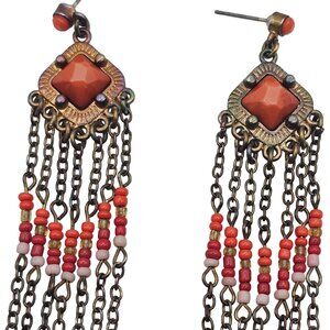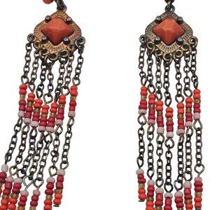 Beaded Orange Dangle Drop Brass Tone Hippie Boho Gypsy Tassel Rustic Earrings