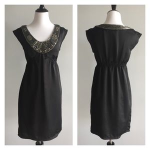 Black party dress with beautiful bib style beading. Silver threaded detailing under bust. Has same threading trim on sleeves and hem. Cinch waist.