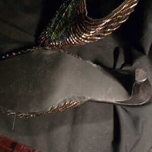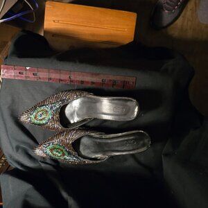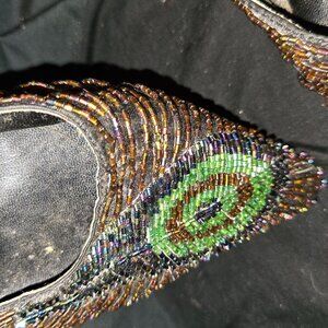 These striking mules feature an exquisite peacock-inspired beaded design that captures attention with its intricate detailing and vibrant colors. The pointed-toe silhouette adds a touch of elegance, while the slip-on style ensures comfort and ease of wear. Perfectly suited for those who appreciate unique, artistic footwear, these shoes make a bold statement.