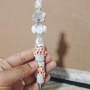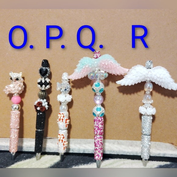 Set of beaded pens with angel wing designs. Features pink, black, white, and silver beads. FOR GOT LETTER S