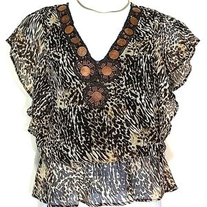 Beaded Peplum Top Blouse v-neck animal print Short Cap Sleeve Sheer Lined Boho