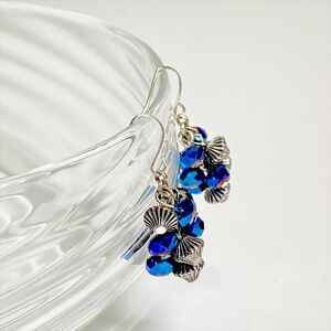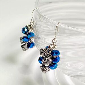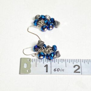 Beaded Pierced Earrings Metallic Blue Crystal Cluster Faceted Dangle Silver Tone