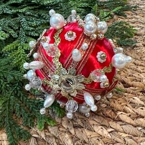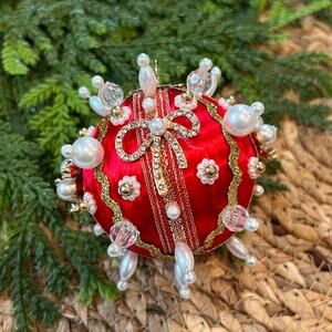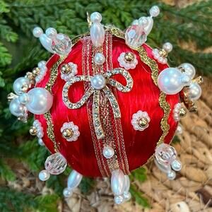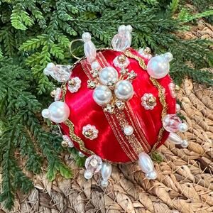 Beaded Push Pin Satin Thread Ball Christmas Ornament Mid Century Vintage Style