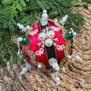 This one has faux crystal bows and pearls with dark green velvet on red with lots of gold.