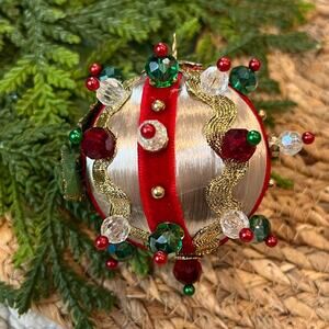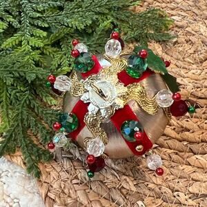 Beaded Push Pin Satin Thread Ball Christmas Ornament Mid Century Vintage Style