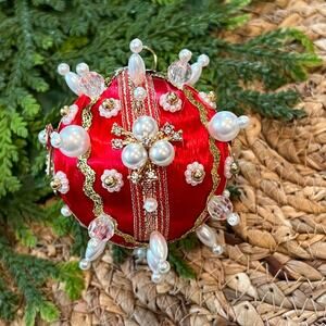 Beaded Push Pin Satin Thread Ball Christmas Ornament Mid Century Vintage Style