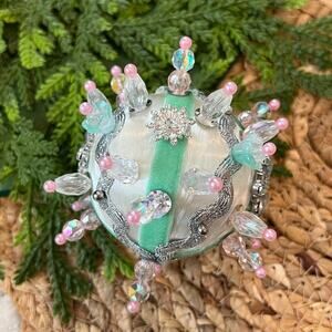 You will receive the ornament shown in photos. Add to a bundle to automatically save an extra 25% off 2 or more. Ornament may be a mix of modern and vintage supplies- this includes the ribbon and trim, brooches, buttons or other focal pieces, beads as well as the satin string balls. I do not know the age or story of everything used. Beads may be resin, plastic, glass, etc. Some pieces may be all modern and some a mix. Some of the vintage string balls may have loose threads. You may see exposed glue or even the white foam in a few spots. They do have a traditional ornament top. You will need to add a hanger or string of your choice for hanging. These are all one of a kind. They are handmade and may have imperfections as a result. Some may not be perfectly symmetrical but they are perfectly kitschy. They are sold as is. Each ornament is listed individually and will ship in a simple kraft box inside a larger mailingbox. Hopefully this will protect any beads and pins from coming loose. If so any dab of craft or hot glue works. ▪️Measurements are approximate only ▪️See photos as they are part of the listing and description ▪️Please note colors may vary in person from on screen ▪️Bundle your likes to save ▪️No modeling or trades ▪️Smoke free home ▪️Pet friendly ▪️Quick shipper ▪️❓ask