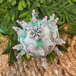 Beaded Push Pin Satin Thread Ball Christmas Ornament Mid Century Vintage Style