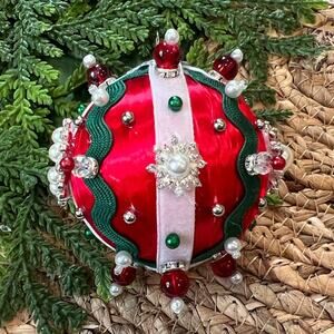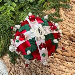 Beaded Push Pin Satin Thread Ball Christmas Ornament Mid Century Vintage Style