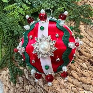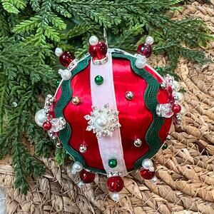 Ornament may be a mix of modern and vintage supplies- this includes the ribbon and trim, brooches, buttons or other focal pieces, beads as well as the satin string balls. I do not know the age or story of everything used. Beads may be resin, plastic, glass, etc. Some pieces may be all modern and some a mix. Some of the vintage string balls may have loose threads. You may see exposed glue or even the white foam in a few spots. They do have a traditional ornament top. You will need to add a hanger or string of your choice for hanging. These are all one of a kind. They are handmade and may have imperfections as a result. Some may not be perfectly symmetrical but they are perfectly kitschy. They are sold as is. Each ornament is listed individually and will ship in a simple kraft box inside a larger mailingbox. Hopefully this will protect any beads and pins from coming loose. If so any dab of craft or hot glue works.
