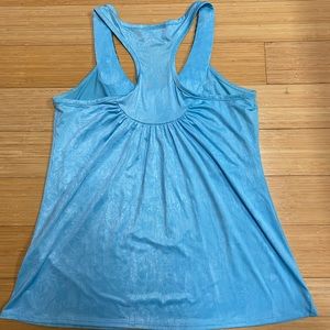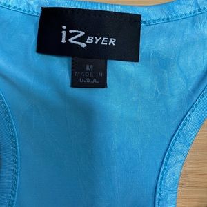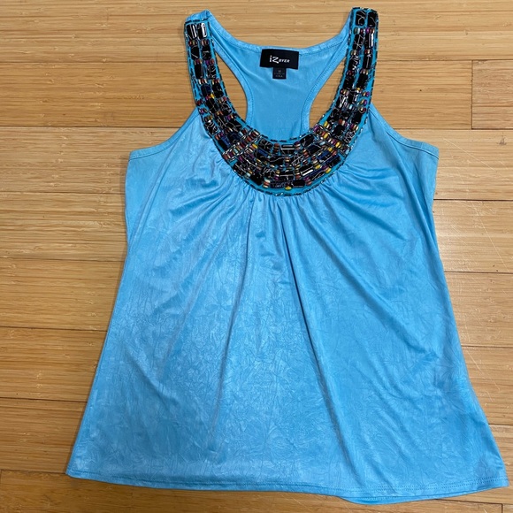 Light blue racerback blouse Has beaded scoop neck line Size Medium 94% polyester 6% spandex Made in USA IZBYER brand