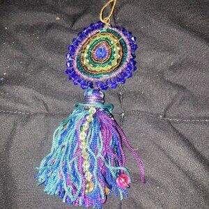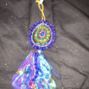 A multi-colored tassel in shades of blue, purple, and pink hangs from the main beaded section.