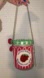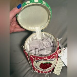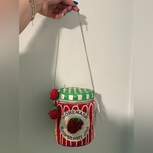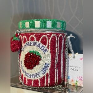 Unique beaded handbag shaped like a raspberry jam jar. Features intricate red and white beadwork with green accents. Includes a silver chain strap.
