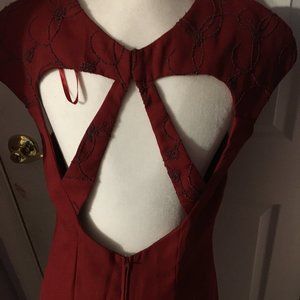 Red dress with beaded embellishments. It's backless and has really cute cut outs around the shoulders.