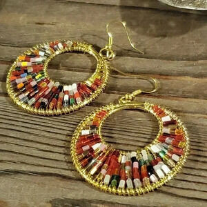 Beaded Red Multi Tiny Glass Beads Gogo Gold Tone Hoop Earrings
