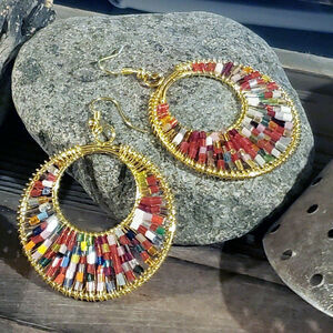 Beaded Red Multi Tiny Glass Beads Gogo Gold Tone Hoop Earrings