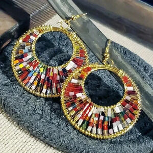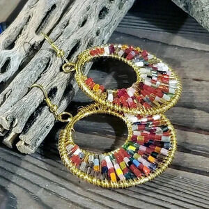 Beaded Red Multi Tiny Glass Beads Gogo Gold Tone Hoop Earrings