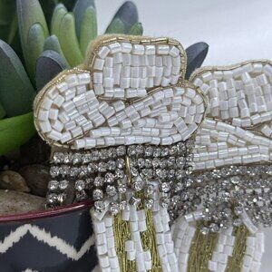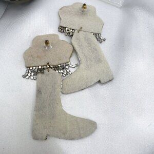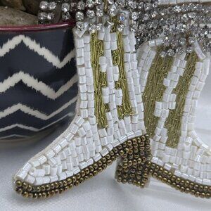 FEATURES: White and gold beads adorn these cowgirl boots and fringed hat. The hat features rhinestone fringe and dangling boots. On stainless steel posts. See photos for more details.