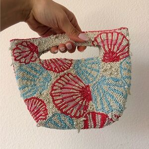 This exquisite clutch features a vibrant shell design with intricate beadwork. The red and blue hues create a stunning contrast, making it a perfect accessory for any occasion.