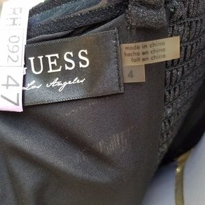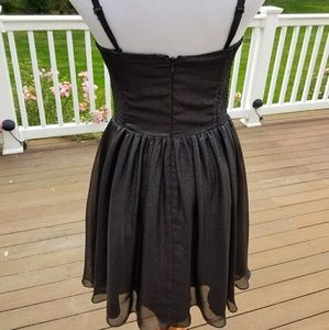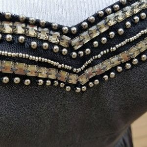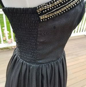 So beautiful! Worn once for my birthday. Color is like a shimmery graphite (sheer) with a black slip lining. Zip closure with elastic side panels. Adjustable straps. About 32" long from top of shoulder. Dress has been dry cleaned and in my closet for some time. I did notice a spot on the side (See last photo). Am not sure if it is a small stain or just an area lacking shimmer? Do not think it will be noticeable when wearing due to your arms but am open to offers. Great dress for holidays!!