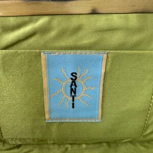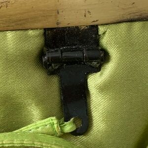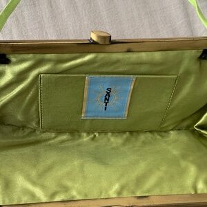 Pristine lime green cloth interior. Thin line green ribbon strap (attached with metal hinges inside the bag) has a 7” drop to wear on shoulder or tuck the strap inside to carry as a clutch.