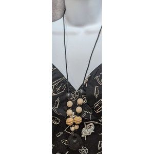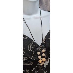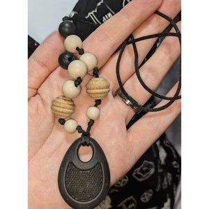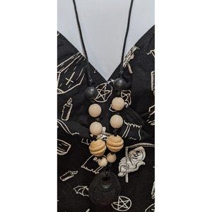 Fun beaded silicone fidget necklace. It's on a black cord with a snap clasp at the back. It has 5 beads on either side that have been hand knotted onto the cord. It has a black teardrop pendant made from a smooth silicone. Both sides have tiny little nubs that are fun and satisfying to squish and play with.