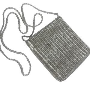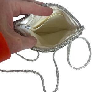 Beaded Silver Metallic Evening Bag with Chain Shoulder Strap Zip Closure Small