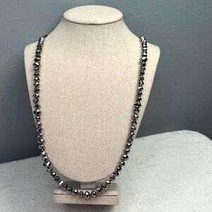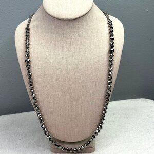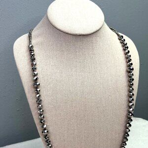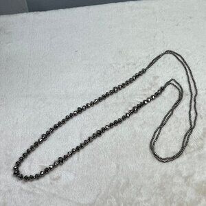 Long beaded necklace in silver tone. Faceted beads which really catch the light and sparkle in person. Good condition. Approx 38" around.