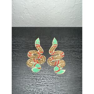 Beaded Snake Green Brown Red Earrings Handmade Stud Unique