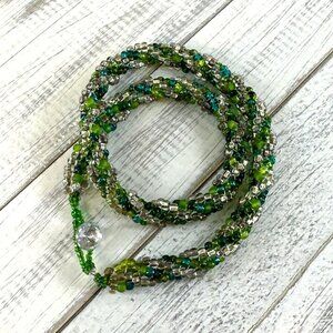 Beaded Spiral Necklace Toggle Closure Green Blue Silver Tone 19 Inch Length