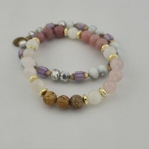 Chic and easy-to-wear stretch bracelet set by Erimish. Includes two coordinated bracelets with a mix of natural stone-look beads in soft pinks, earthy browns, purples, and whites. Gold-tone accents and a signature Erimish tag complete the look. Perfect for stacking or wearing solo.