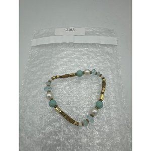 Beaded Stretch Bracelet in Tones of Gold and Turquoise 7 inch