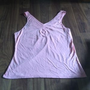 Gently used pink top. It is size medium but fits more like a large. Very soft material so it is comfy as well as stylish.