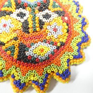 Small sun-shaped plaque covered in seed beads. Measures about 3 inches wide. Believed to be folk art from Mexico.