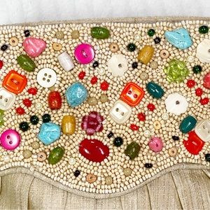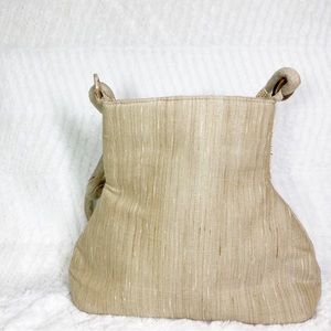 Bell shaped fabric shoulder bag with unique beaded front panel. Tan lined in cream satin. Small slip pocket inside. Magnetic snap closure. Intertwined padded handles. Flat bottom. Back plain. Bead detail at bottom of handles. Meas approx: 10’w x 8”h x 3”d. Strap drop 12”. Condition: excellent. Smoke free and pet free environment.