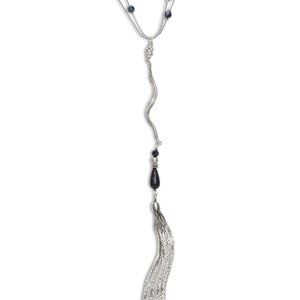 Designed with a refined bohemian feel, the weighted tassel is adorned with a pavé top and cobra-style chain that drops from blue-hued interspersed beads and metallic accents. Handcrafted with nickel-free and lead-free metal. From White House Black Market.