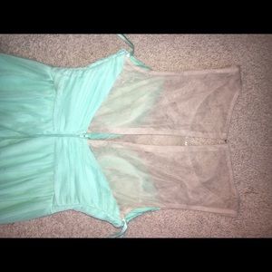 Simple, cute, aquamarine prom dress. Size 5 in Juniors! Using Sherri Hill for exposure. Illusion sweetheart neckline with mesh netting. Iridescent beading and chiffon. Open back! Worn only once and is great for a senior prom or formal occasion.