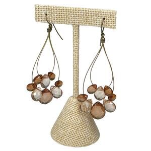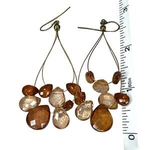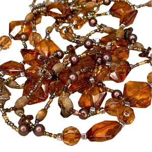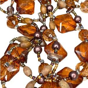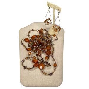 Beautiful three strand necklace about 16" long, each strand is a different length with the longest at about 16" drop. The necklace has amber colored beads as well as smaller iridescent and I believe wooden and shell beads. The earrings have two beaded layers. The necklace has a lobster clasp closure.