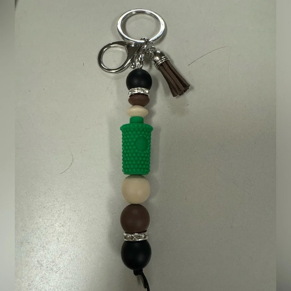 Handmade beaded keychain with silicone beads and a super cute ‘Starbucks’ studded tumbler bead! All attached to a silver lobster clasp.
