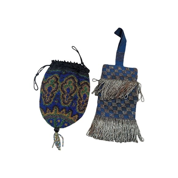 Beaded Woven Drawstring Pouch Lot 2 Unique Bags Fringed & Patterned Small Vinta